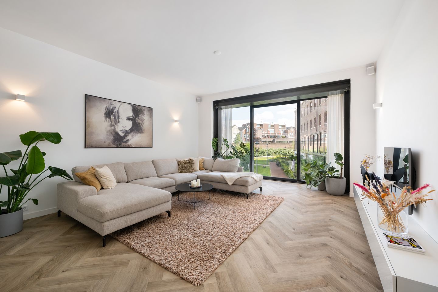 Royale living (circa 6.49 x 5.01 m) met volledig glazen pui voorzien van schuifdeuren. Vanwege het ruim 3 meter hoge plafond en de raampartijen van vloer tot plafond is er bijzonder veel lichtinval en vrij uitzicht op het voorgelegen binnenterrein in de richting van de voormalige gevangenismuur.