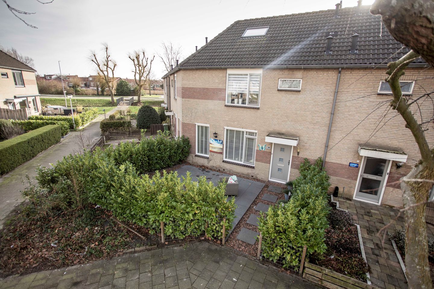 We beginnen bij de ruime –op het noordoosten gelegen– voortuin, waar een groene haag zorgt voor de privacy. De tuin is betegeld met een grote, grijze, tegel en daaromheen terracottakleurig split. Er is meer dan voldoende ruimte voor een lounge set, of misschien wel een picknicktafel. Naast de voordeur een rij met grote grijze potten met hierin grijze grassen. Een moderne voordeur geeft toegang tot de woning.
