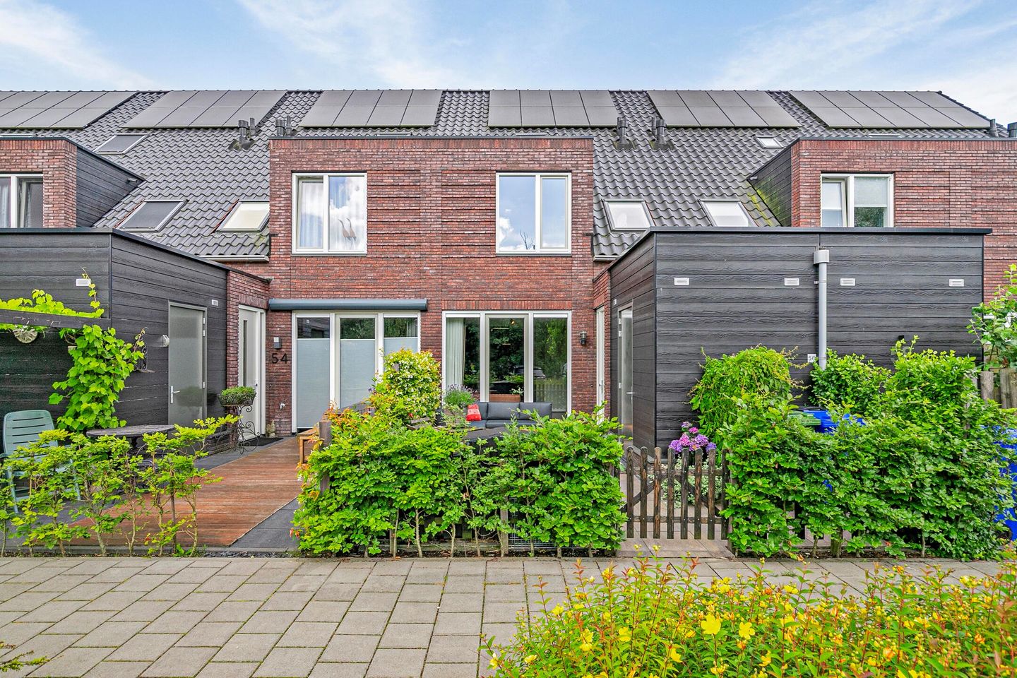 Dit type woning heeft zogezegd alleen een voortuin, deze is gelegen op het westen en is praktisch ingedeeld met afwisseling van terras en groen, uiteraard is er ook een berging aanwezig.