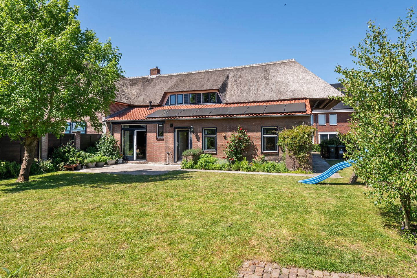 Buiten is het net zo genieten als binnen: de tuin is diep, groen en heerlijk veelzijdig. Met meerdere terrassen, een moestuin, kas en een speelgazon voor de kinderen is hier plek voor ontspanning én activiteit. Zelfs de kippen hebben hun eigen onderkomen! De oprit biedt ruimte voor twee auto's en via het zijpad wandel je zo naar het terras achter de woning. Het perceel grenst aan een sloot, wat zorgt voor extra rust en privacy.
