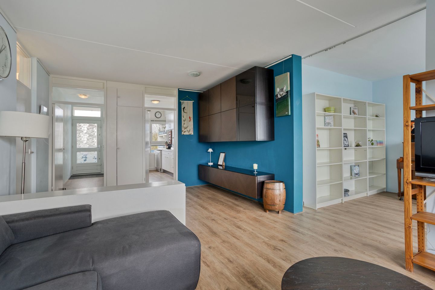 De woonkamer beschikt over een zijkamer waardoor een L-vormige indeling ontstaat. De grote raampartijen zorgen voor veel daglicht. Vanuit de woonkamer is er een deur naar het gunstig gelegen balkon met vrij uitzicht over groen.