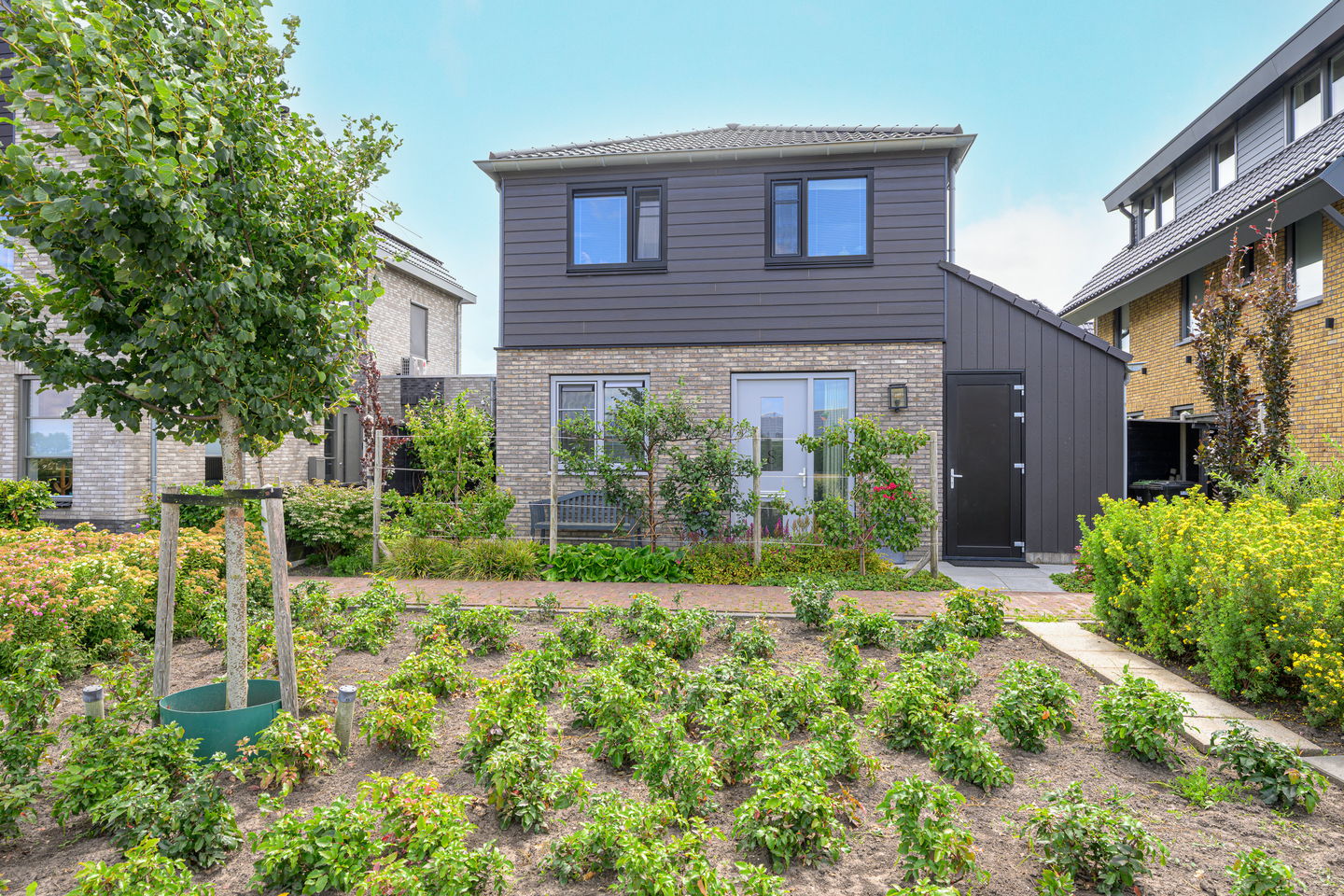 De voortuin is smaakvol aangelegd met vaste beplanting. De tuin is voorzien van een decoratieve pruimenboom en twee perenbomen in leivorm, een charmante blikvanger bij binnenkomst.
