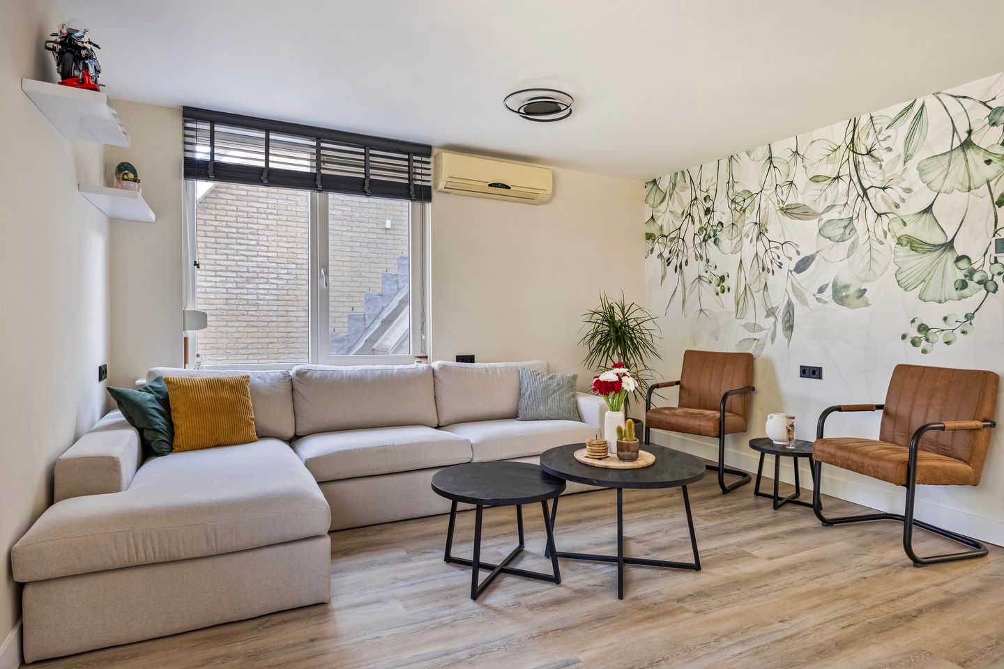 De L-vormige woon-/eetkamer staat in open verbinding met de keuken. In de woonkamer zorgen ramen aan twee zijden zorgen voor veel lichtinval en de airco-unit zorgt voor een aangename temperatuur. Op een van de muren zie je mooi behang en de lichtschakelaars zijn, net als de stopcontacten, uitgevoerd in het zwart.
