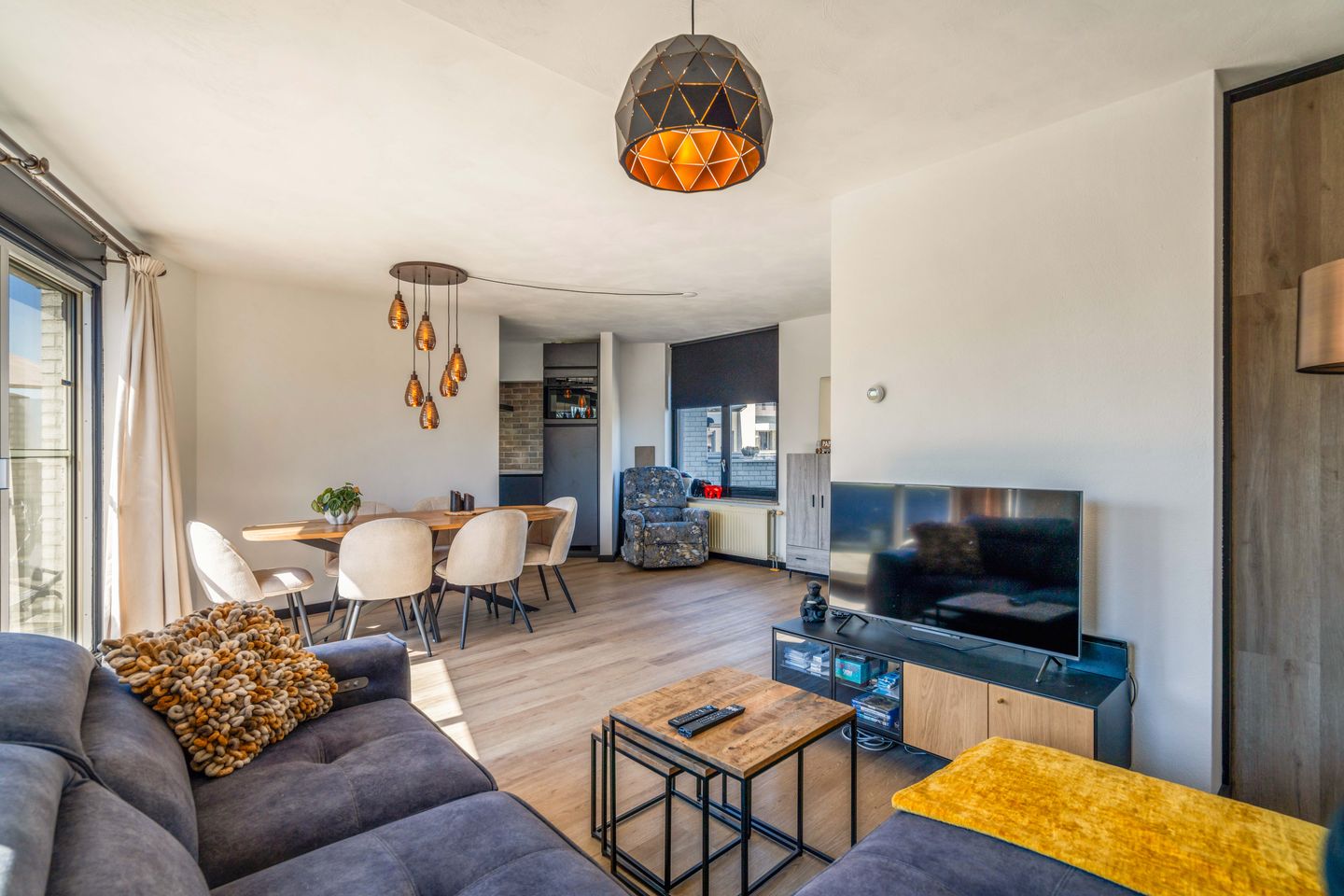 Ruime woonkamer, bestaande uit een ruim zitgedeelte, een eetgedeelte en een half-open keuken. Via een een aluminium schuifpui is er toegang tot het riante dakterras. De grote schuifpui en raampartijen zorgen voor veel lichtinval en een aangenaam contact met buiten.