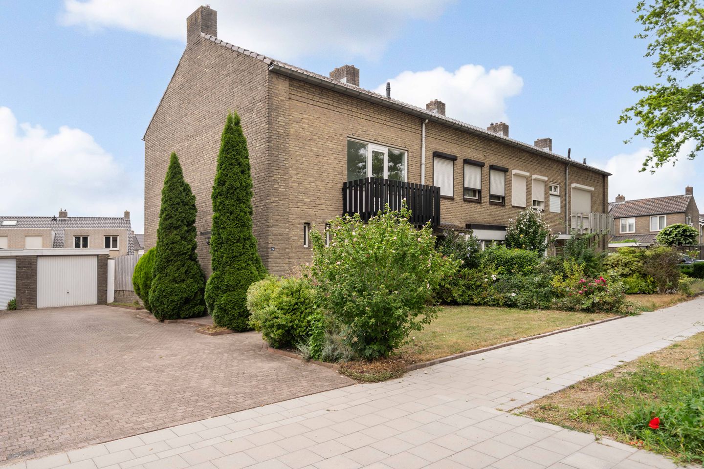 Aan de linkerzijde van de woning bevindt zich een ruime oprit met voldoende ruimte om 2 auto's op eigen terrein te parkeren.