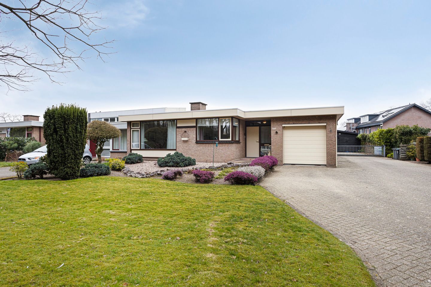 Aan de voorzijde de grote inrit, aansluitend de grinttuin met zwerfkeien, gazon, border met vaste planten, heesters en bomen. Het gazon lopend tot aan de bomen is eigendom.