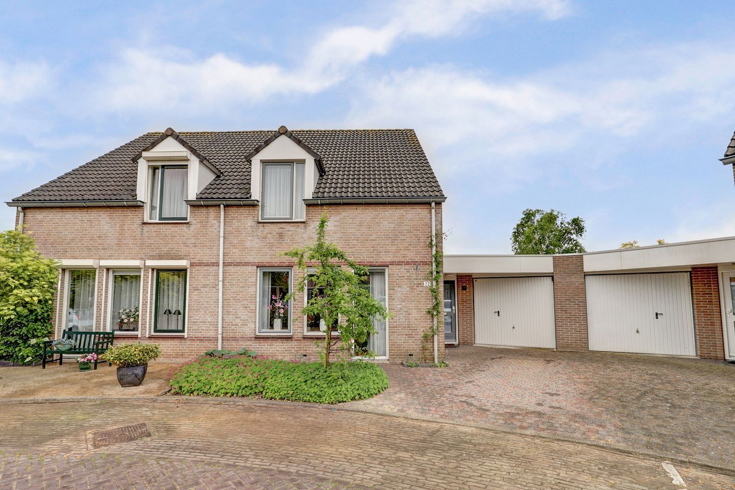 De aangebouwde garage is van buitenaf toegankelijk en biedt voldoende ruimte voor een voertuig, fietsen en opslag.