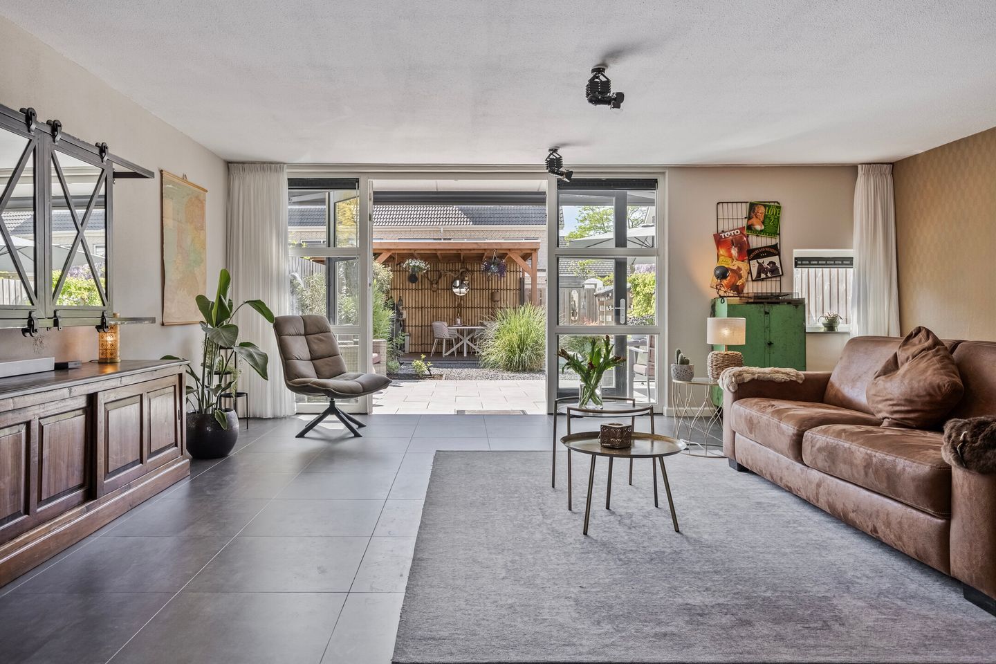 Vanuit de woonkamer heeft u toegang middels dubbele openslaande deuren tot de achtertuin.