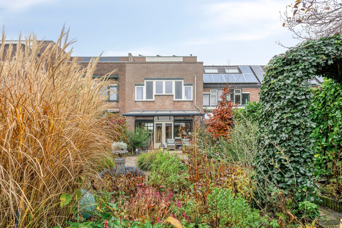 Diepe, fraai aangelegde achtertuin, met veranda tegen de achtergevel, sierbestrating, borders, pergola en houten overkapping met berging achterin. Deze tuin is achterom te bereiken. Aan de voorzijde is parkeerruimte voor twee personenauto's op eigen terrein!