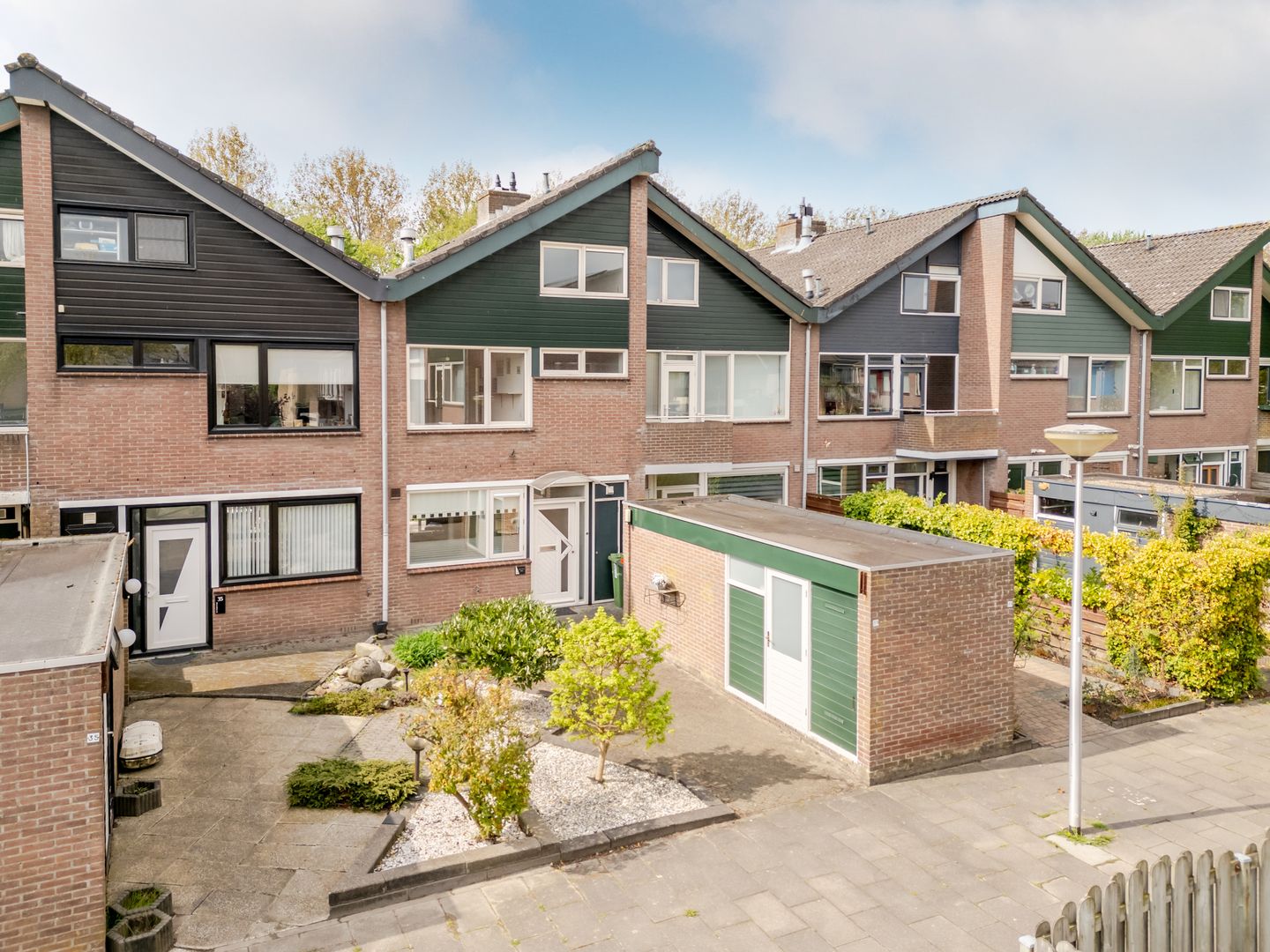 De voortuin is onderhoudsarm aangelegd met sierbestrating en enkele struiken. Hier bevindt zich ook een praktische, gemetselde schuur van 3 x 2 meter – ideaal voor fietsen of tuinspullen.