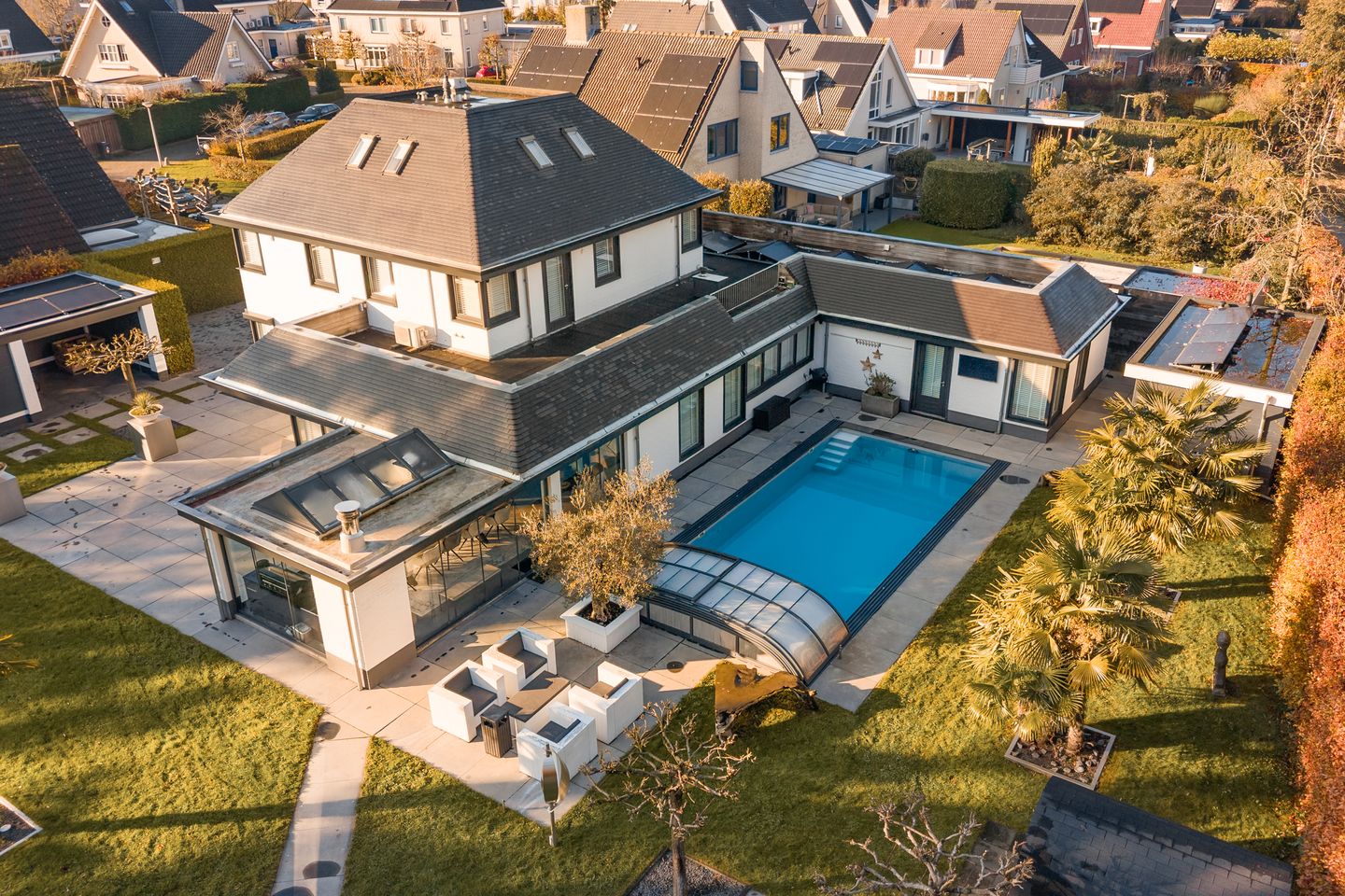 - Gelegen op een royaal perceel van 1.717 m² met fraai aangelegde tuin, zwembad, sauna, hammam en meerdere terrassen;