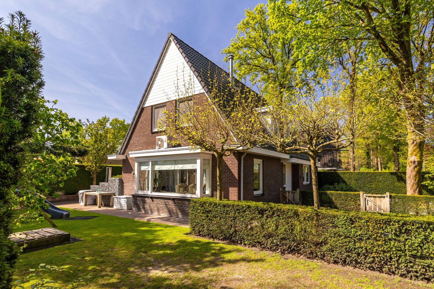 Rondom de woning is een heel fraai aangelegde en verzorgde tuin te vinden. Uiteraard is er veelvuldig gebruik gemaakt van groen zoals een gazon, planten, bomen en diverse hagen. Hierdoor komt het perceel uitstekend tot zijn recht in de omgeving. Daarnaast zijn er middels sierbestrating diverse terrassen gecreëerd. Ook zijn er verschillende plekken gemaakt met (mogelijkheid) voor speeltoestellen.