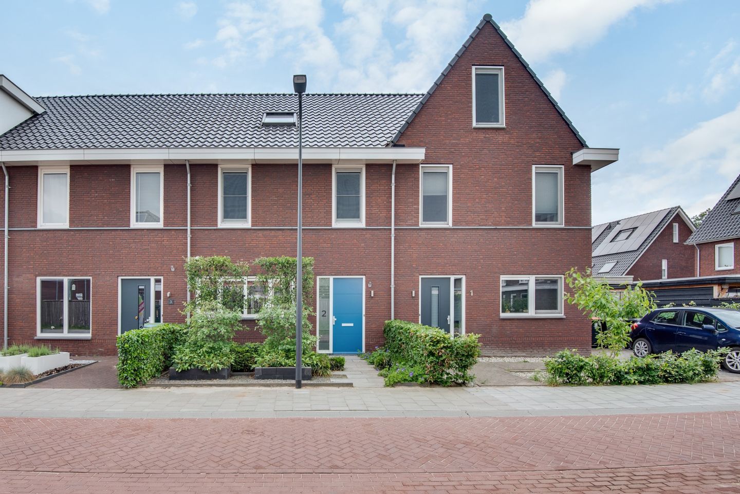 De voortuin is voorzien van een groenborder en bestrating.