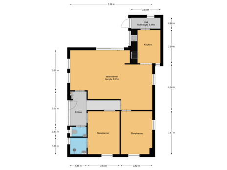 Aansluitend aan de woonkamer bevindt zich de keuken, die bereikbaar is via een speelse boog. Daarnaast is de keuken ook toegankelijk via de hal bij de tweede entree aan de achterzijde van de woning, wat zorgt voor extra gebruiksgemak.