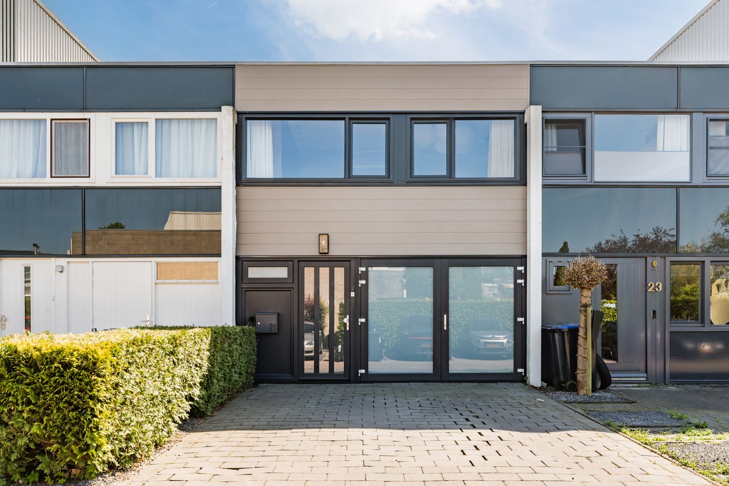 De voortuin is strak en functioneel ingericht met een ruime oprit die plaats biedt aan één auto op eigen terrein — praktisch én comfortabel, zeker in een woonwijk. De oprit is netjes bestraat en wordt aan één zijde geflankeerd door een groene haag, wat zorgt voor een verzorgde uitstraling en een beetje extra privacy. De dubbele deuren geven toegang tot een ruimte die op de plattegrond staat aangeduid als kantoor. Deze multifunctionele kamer is via de oprit gemakkelijk bereikbaar en daardoor ideaal voor bijvoorbeeld werken aan huis, een praktijkruimte of het stallen van fietsen en motoren.