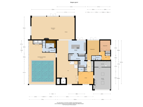 Aan het eind van de hal bevindt zich het zwembad met wellness ruimte. Aan de tuinzijde is een groot terras met zonnelux overkapping. De schuifpui bij het zwembad kan helemaal worden opengeschoven waardoor binnen en buiten in elkaar overlopen.