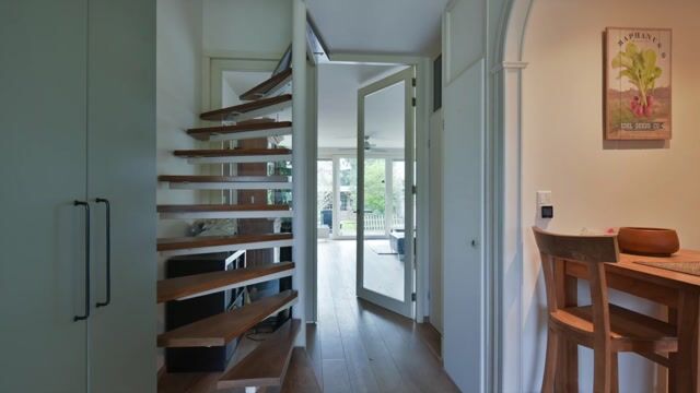 De tuingerichte woonkamer is royaal en heerlijk licht, met een warme houten vloer en strak afgewerkte wanden. Dankzij de grote schuifpui geniet u van volop daglicht en heeft u zicht op de diepe achtertuin aan sierwater. De achtertuin is op het zuiden gesitueerd.