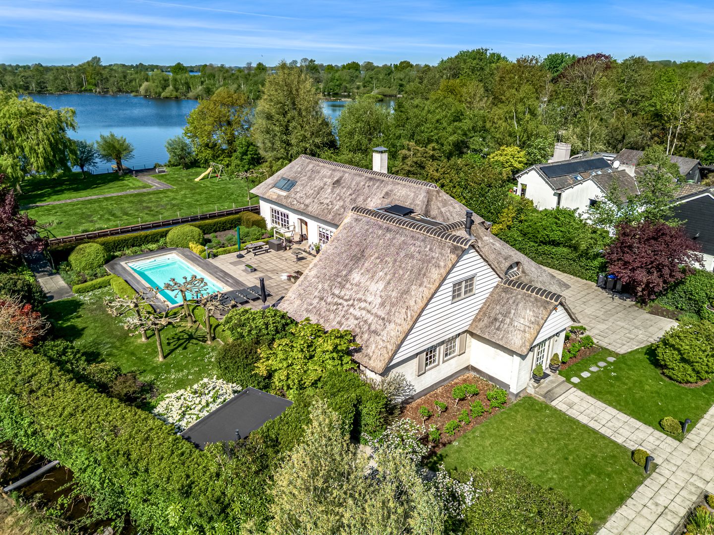De villa is gelegen op een royaal perceel en biedt alles wat het hart begeert. Vanaf uw eigen aanlegsteiger vaart u zo de plassen op voor een ontspannen tocht met de sloep of voor een verfrissende duik. Voor wie liever op eigen terrein blijft, wacht het verwarmde privé zwembad – een zonovergoten verlengstuk van de royale tuin waar u in alle rust op meerdere terrassen of plekken geniet van de lange zomers.