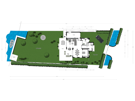 Middels openslaande deuren vanuit zowel de eetkamer als de woonkamer stapt u het royale terras, eveneens uitgevoerd in Belgisch leisteen, op. Dit terras is volledig onderheid en heeft een buiten open haard. Hier geniet u van lange zomeravonden met uitzicht over de heerlijke tuin van ca. 400m² en heeft u uw eigen aanlegsteiger aan het water.