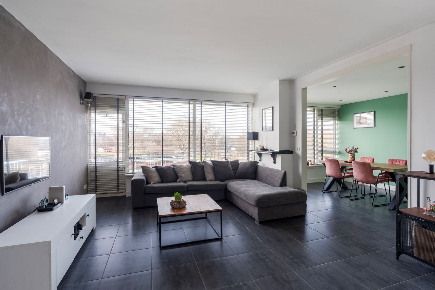 De woonkamer is met recht het hart van de woning te noemen. Dankzij de slimme toevoeging van een extra (slaap)kamer is een bijzonder royale leefruimte ontstaan. Of u nu droomt van een riante loungehoek of een lange eettafel voor uitgebreide diners met vrienden: hier kan het allemaal. De nette plavuizenvloer met comfortabele vloerverwarming loopt naadloos door vanuit de hal, wat zorgt voor een rustige en luxe uitstraling.