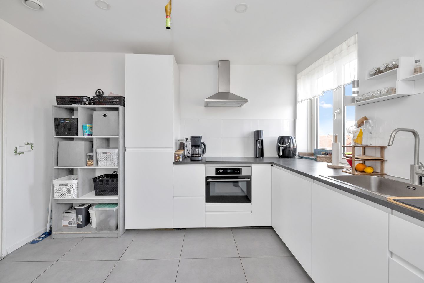 Ruime woonkeuken met moderne hoekopstelling en inbouwapparatuur.
