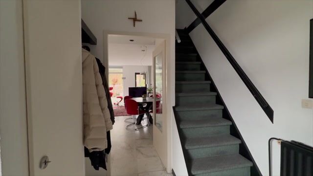 Entree woning, ruime ontvangsthal voorzien van trap naar de eerste verdieping, meterkast en keurig toilet met hangend closet, hand wasbakje en betegeld tot het plafond.