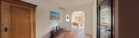 Vanaf de straat is er een brede open toegang tot de voortuin, die opvalt door de mediterrane planten en de grote palmboom. Het pad naar de voortuin is bestraat en aan de gevel van de woning hangt een markies.