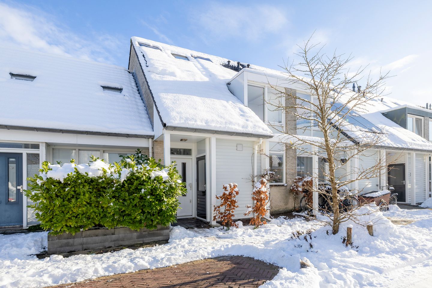 Aan de voorzijde vind je een stenen berging voor de fietsen en boven de voordeur een overkapping zodat je droog staat bij het zoeken naar je sleutelbos terwijl net die bui overtrekt en jij met de boodschappen naar binnen wil.
