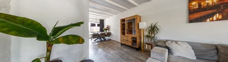 De woonkamer is verdeeld met een zithoek aan de voorzijde en het eetgedeelte aan de achterzijde. Authentieke elementen zoals het balkenplafond, de erker, de sfeervolle open haard en natuurlijk de vloerverwarming zorgen voor warmte en karakter.