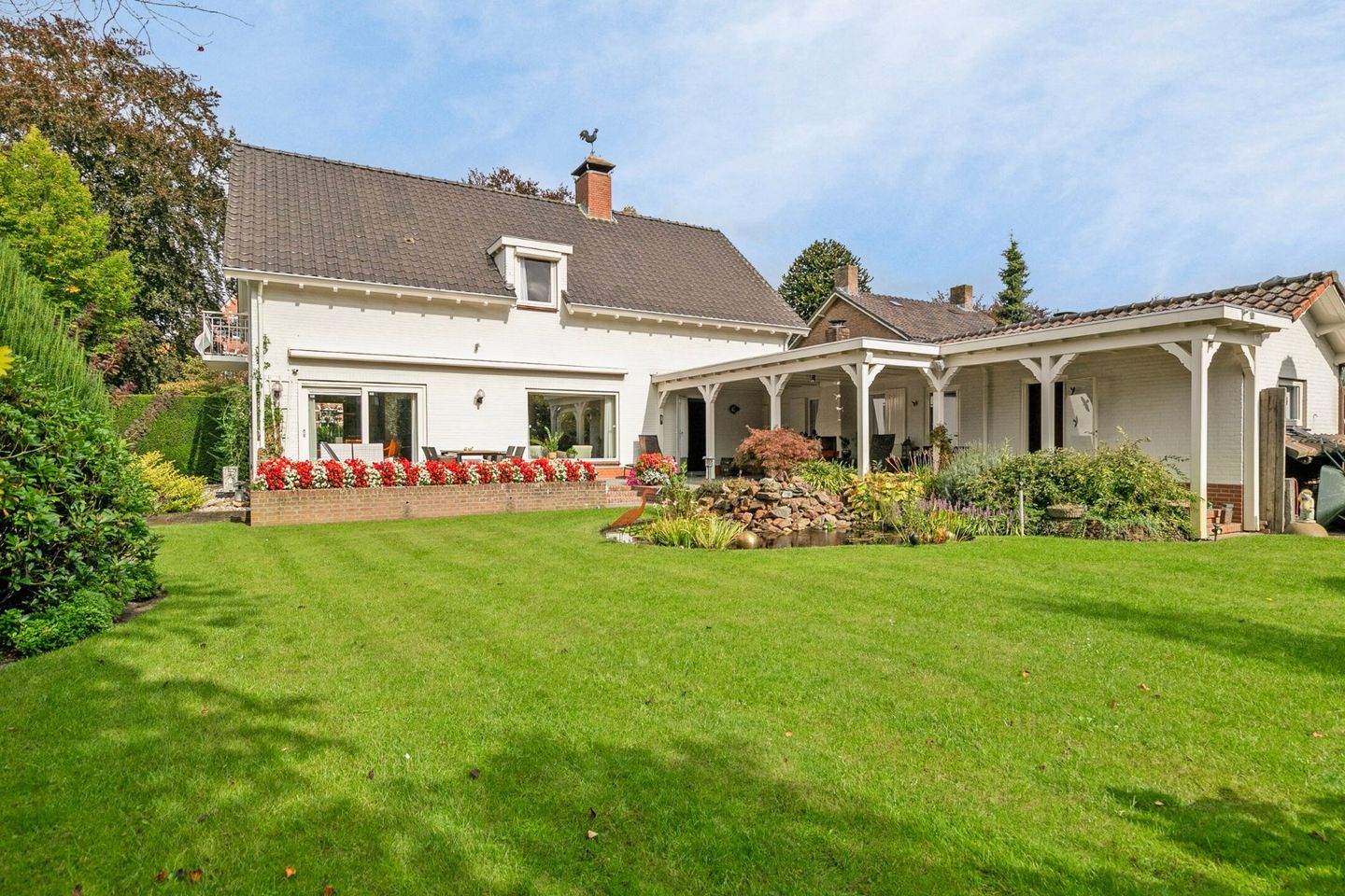 Vanuit de bijkeuken komt u op het grote, deels overdekte terras met sierbestrating en een gezellige open haard. Het terras ligt verhoogd waardoor een overzicht wordt verkregen over de prachtige tuin (voorzien van sproei-installatie) met vaste aanplant, gazon en vijver. Opp achtertuin ca. 450 m².