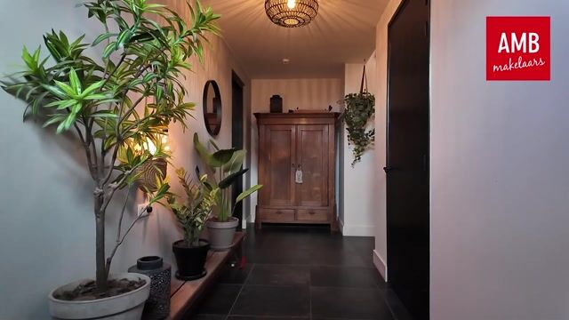 Via de voordeur betreed je de woning in een verzorgde en sfeervolle hal die meteen de juiste toon zet. De donkere tegelvloer, lichte wanden en warme accenten zorgen voor een rustige en uitnodigende binnenkomst. Aan de rechterzijde bevindt zich de meterkast, gevolgd door een praktische berging met de opstelling van de warmtepomp, elektrische boiler en waterontharder, en volop extra bergruimte.