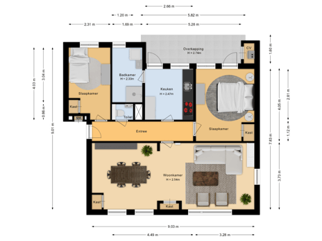- 32 m² (4,24 meter diep en 7,55 meter breed)