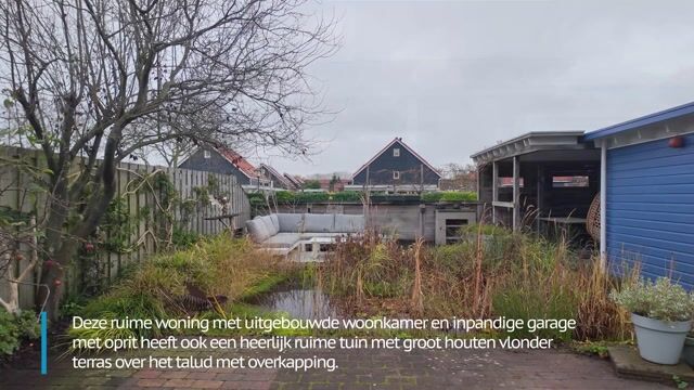 De achtertuin heeft een vrije ligging aan de watergang en is royaal ingedeeld met een groot houten vlonderterras over het talud, grenzend aan een sfeervolle, ruime overkapping. Het grote stenen terras met fraaie vijverpartij en de extra houten berging maken de tuin tot een heerlijke plek om te ontspannen en te genieten.