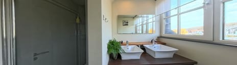- Douche, dubbele wastafel, wastafelmeubel, inloopdouche, vloerverwarming, en wastafel