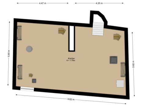 Via de hal en een vaste stenen trap bereikt u de ruime en droge kelder, die zich over de gehele breedte van het voorhuis uitstrekt. Hier bevinden zich de close-in boiler, gasgestookte boiler, de hete luchtverwarming (cv-installatie) en de wasruimte.