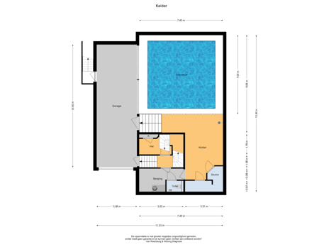 Hal, bijkeuken, berging/opslagruimte, ruim bemeten wellnessruimte met inloopdouche, droge en natte sauna, wc en wastafel, zwembad van ca. 52m² (7,40 x 6,95 x 1,60) met jetstream, garage met verwarmde oprit en elektrisch bedienbare roldeur en technische ruimte, tevens 2e entree en voldoende daglichttoetreding.