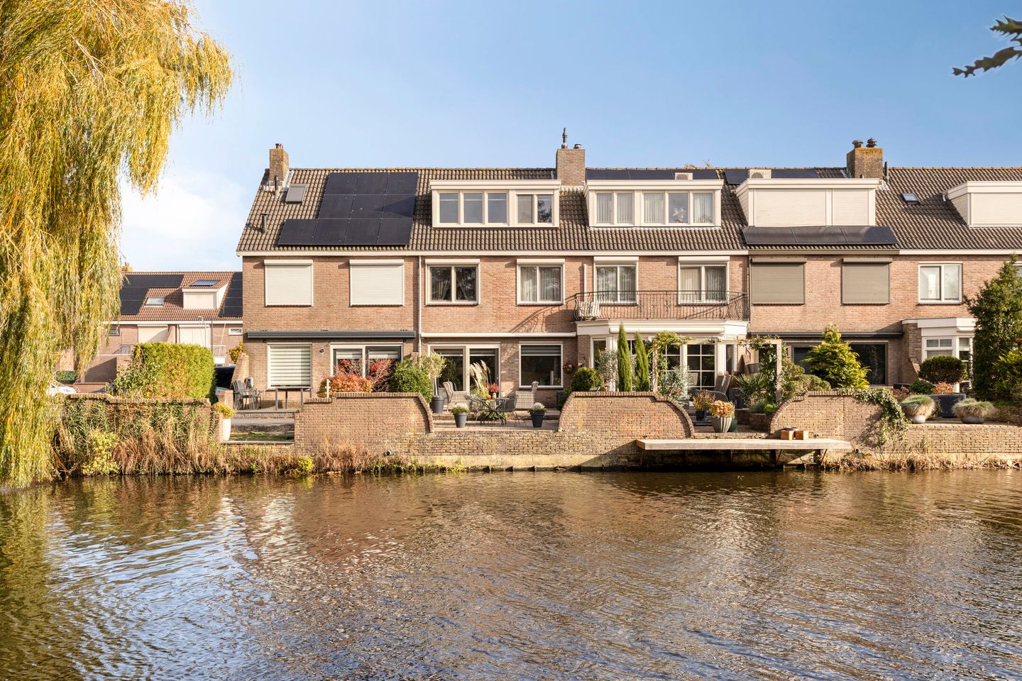 De achtertuin ligt op het westen, is mooi aangelegd met een zonneterras, grenst aan een brede waterpartij en biedt een heerlijk uitzicht, goede zonligging en privacy. Vanaf het begin van de middag tot de prachtige zonsondergang is het hier echt genieten geblazen.