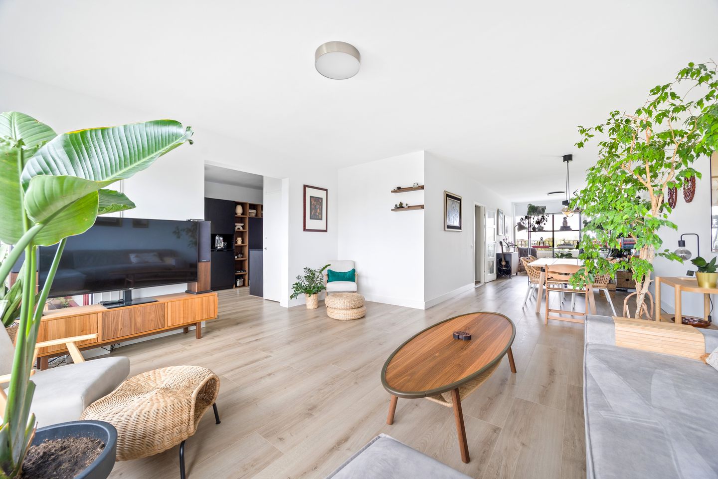 The entrance of the apartment opens into a spacious hallway with a meter cupboard, separate toilet and built-in storage. From here, all rooms are accessible. The generous and bright L-shaped living room offers both a comfortable sitting area and a spacious dining area. Adjacent is the modern kitchen, completely renovated in 2022 and fitted with a full range of built-in appliances. The kitchen provides access to the first balcony, offering space for a comfortable seating area. The kitchen also has a separate storage area, conveniently arranged as a laundry room.