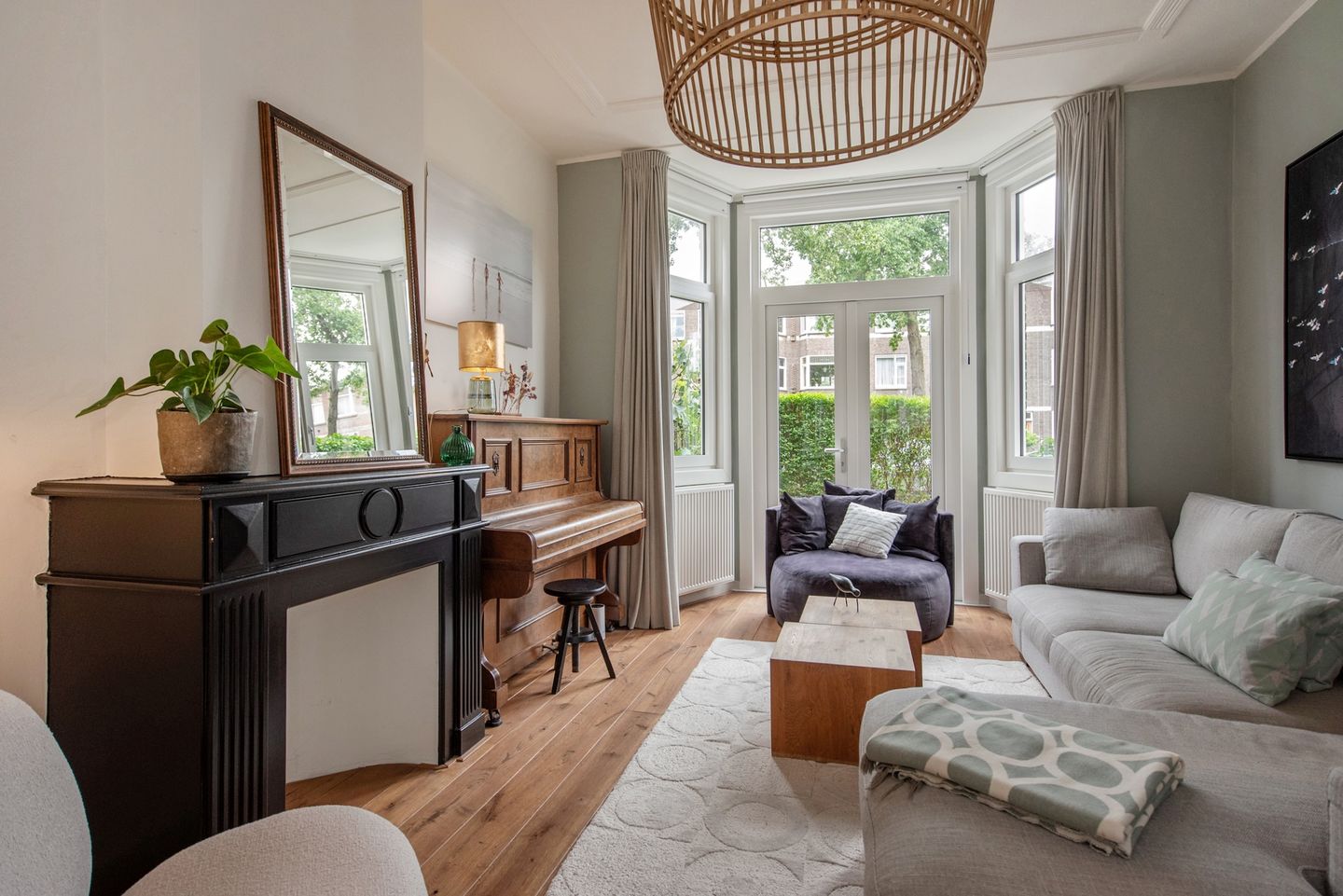 Authentieke stijlkenmerken zoals paneeldeuren, plafondlijsten en een prachtige zwarte schouw