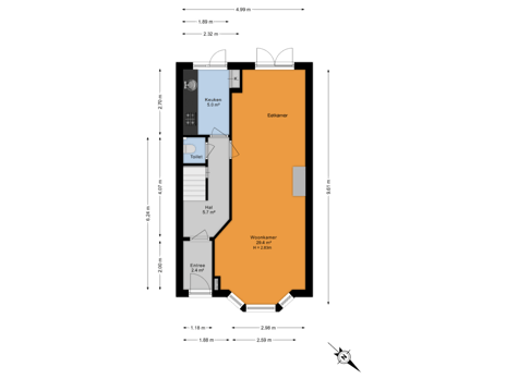 - 46 m² (8,45 meter diep en 5,49 meter breed)