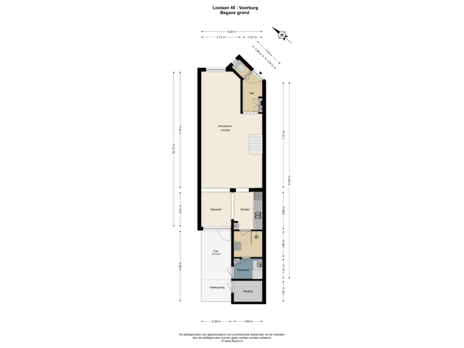 Via de entree kom je in de hal met toiletruimte en meterkast. Vervolgens stap je binnen in de lichte doorzonwoonkamer, met aan de achterzijde de eetkamer. Hier heb je direct toegang tot de achtertuin, die is voorzien van een achterom en een separate berging die alleen vanuit de tuin toegankelijk is. De moderne keuken grenst aan de eetkamer en is uitgerust met diverse inbouwapparatuur. Aansluitend bevindt zich de badkamer met douche en wastafel. Daarachter ligt een praktische wasruimte met aansluitingen voor de wasmachine, vaatwasser en ruimte voor extra apparatuur.