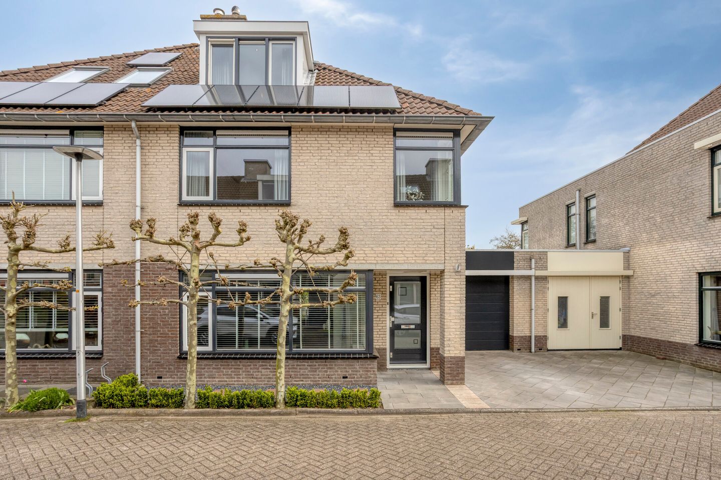 Via de voortuin met oprit en toegang tot de garage bereik je de voordeur.