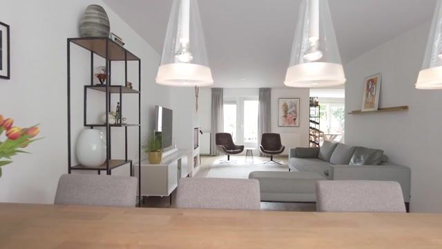 De aangrenzende woonkamer is ronduit royaal en biedt meerdere indelingsmogelijkheden. Aan de voorzijde kijk je vrij de rustige straat in, terwijl de achterzijde zich via grote raampartijen naar de tuin opent. Deze prachtige leefruimte biedt moeiteloos ruimte aan een comfortabele zithoek rond de moderne houthaard en een ruime eettafel.