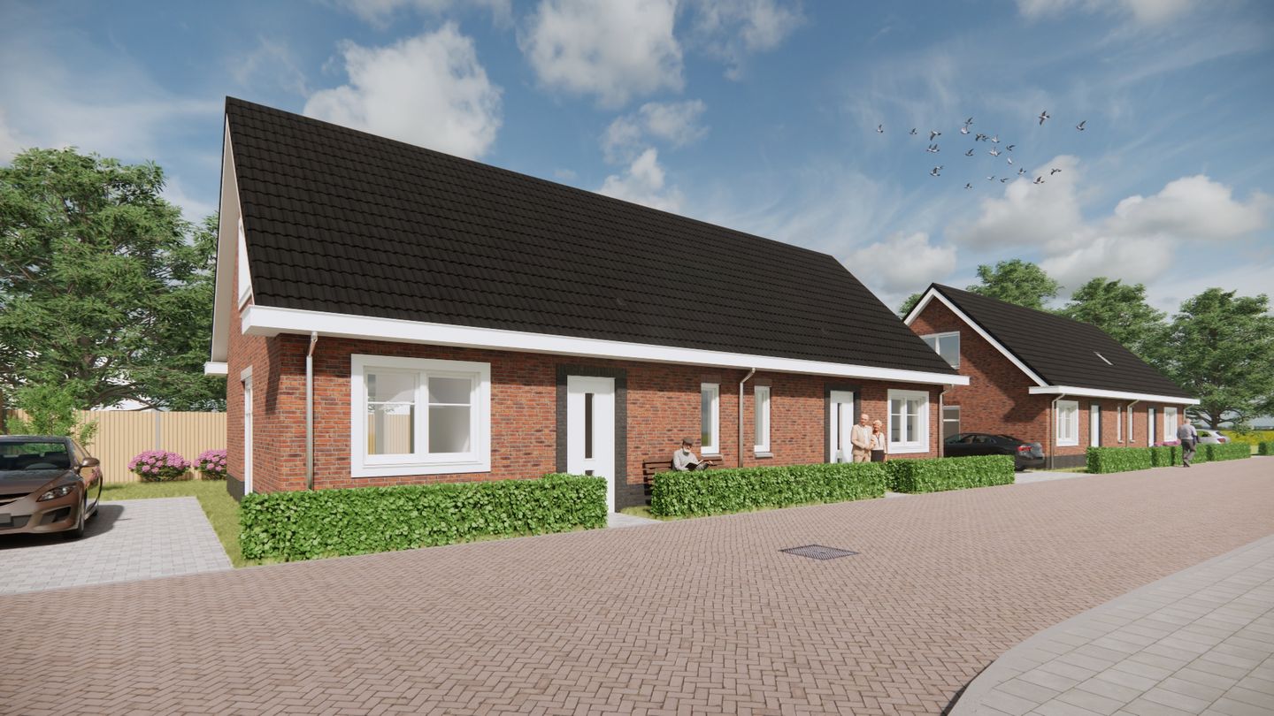 'Vier nieuwe seniorenwoningen in een groene dorpsomgeving.'
