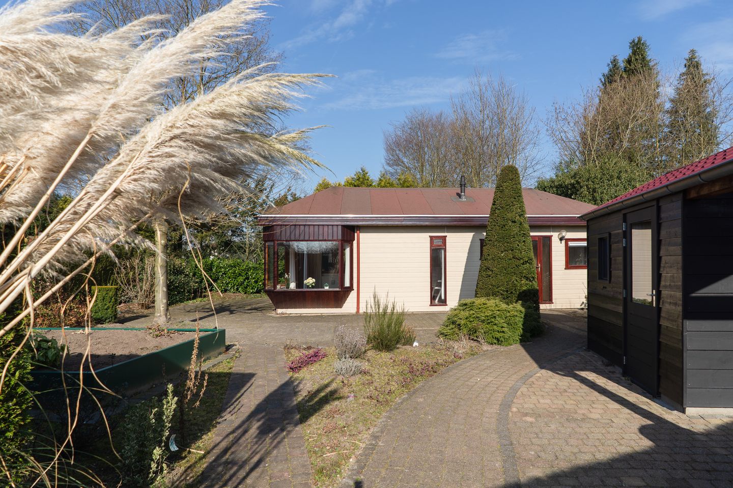 Het perceel is rustig gelegen en wordt omzoomd door hagen en bomen en heeft opvallend veel privacy. Een grote moestuin bak maakt het mogelijk om eigen groentes te kweken of in te poten met weelderig bloeiende bloemen. Het terras is royaal en heeft een prima zonligging, echt een prachtige plek om tot