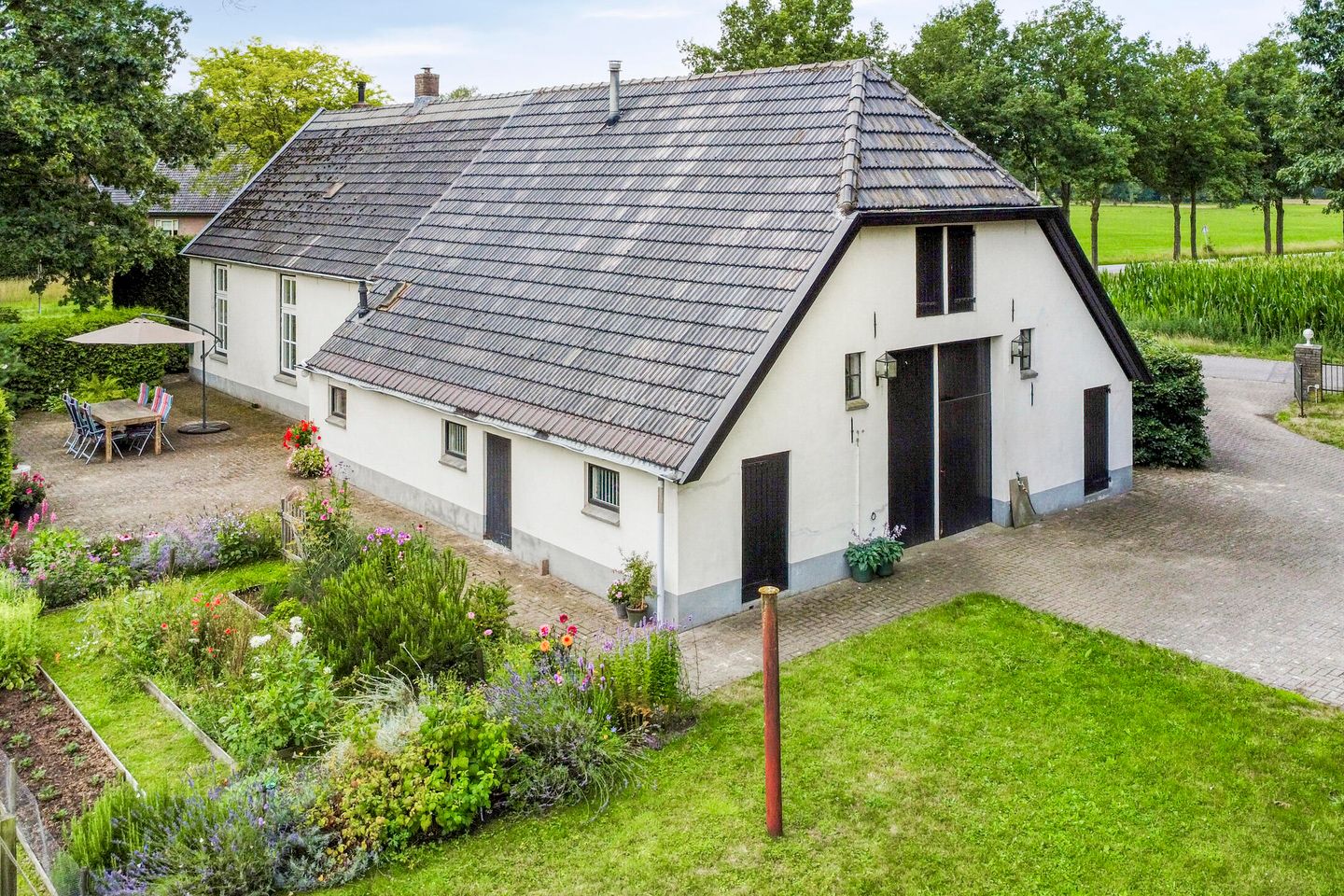 Dit grote erf is voorzien van een prachtig aangelegde tuin, met kleurrijke bloemperken en gezellige zitjes. Aan de achterzijde van het huis is de deel te bereiken via de grote deeldeuren. Hier zijn nu drie ruime paardenboxen gebouwd.