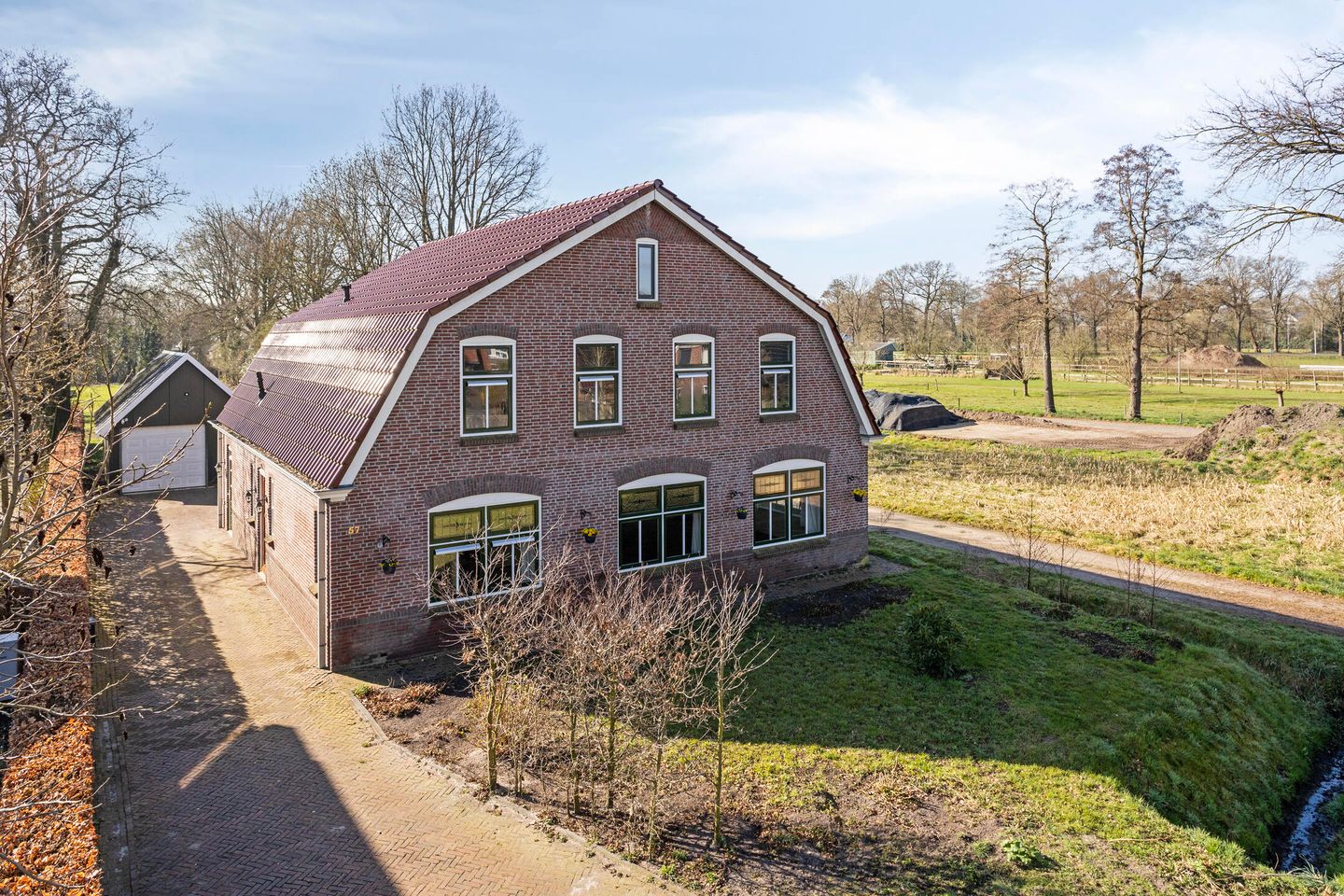 De aangelegde tuin rondom de woning biedt volop privacy en rust, met meerdere terrassen om heerlijk buiten te zitten. De vrijstaande garage maakt het plaatje compleet: plek voor de auto, fietsen, tuinspullen en meer.