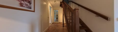 Die Treppe in der Eingangshalle führt in den ersten Stock. Vom Treppenabsatz aus hat man Zugang zu den vier geräumigen Schlafzimmern und dem Badezimmer (mit Fußbodenheizung). Eines der vier Schlafzimmer hat einen angrenzenden begehbaren Kleiderschrank. Auf dem Treppenabsatz befindet sich auch eine Dachbodenleiter. Diese führt zu einem Speicher auf dem Dachboden.
