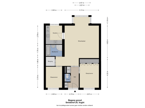 Vanuit de hal zijn verder twee slaapkamers van respectievelijk circa 8 en 12,5 m² bereikbaar, een inpandige berging annex wasruimte met aansluitingen ten behoeve van wasmachine/droger en de opstelling van de unit van de mechanische ventilatie en tenslotte de betegelde badkamer met ligbad, douche met spatwanden, wastafel en design radiator.