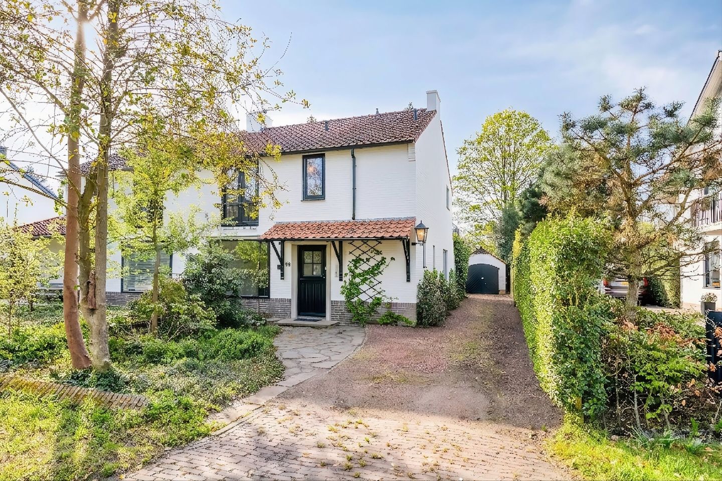 Wide front garden with mature planting and space for multiple cars. A wide path runs alongside the house to the garage and the garden. At the front door is a covered entrance, which provides access to a spacious hall with a tiled floor, wardrobe, meter cupboard, and toilet with a washbasin. The staircase to the first floor is located in the hall, with a practical storage cellar underneath.